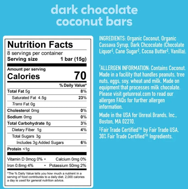 * UNREAL is on a mission to build a world where you don't have to be afraid of your food, starting with your favorite indulgent snacks. * ONLY 53G SUGAR: we keep sugar to a minimum, without using sugar alcohols or artificial sweeteners. We carefully formulate our bars with only the best, quality ingredients. * ALL-NATURAL: our cups are non-gmo project verified and made in small batches with fair trade certified ingredients. * ALL-REAL - certified gluten free by GFCO, certified vegan, no dairy ingredients, no soy ingredients, no artificial flavors, no sugar alcohols, no preservatives, and no fillers.